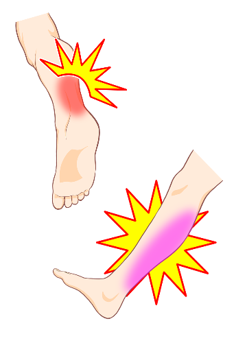 | シンスプリント | ランナーに多く見られ、スネの内側に痛みが出る。運動中は痛く、運動をやめると痛みはおさまる。 |